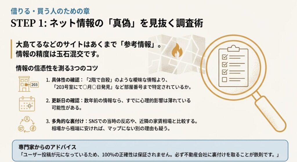 この記事を最後まで読めば、大島てるなどのサイトを賢く使いこなし、心理的瑕疵のある物件のリスクを回避する具体的な方法が分かります。